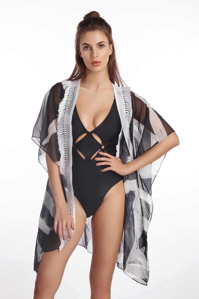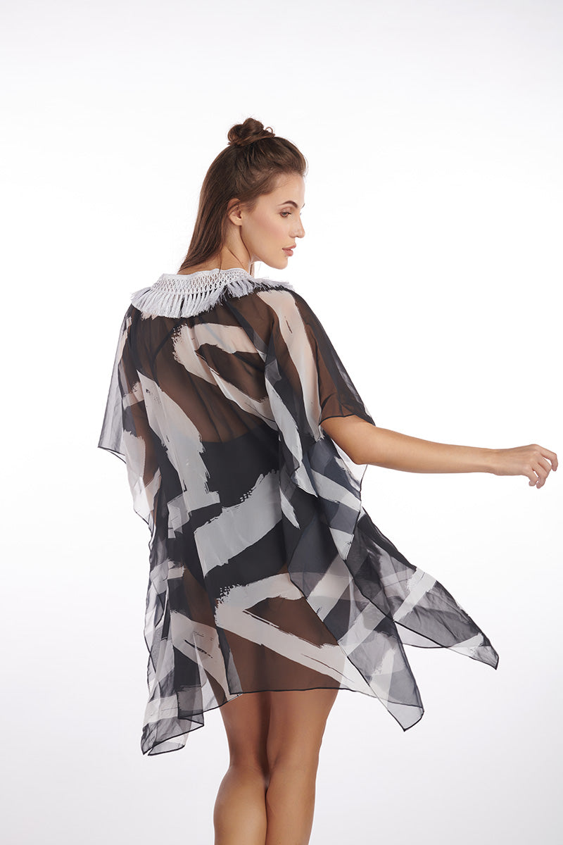 The classic black and white stripes add a touch of timeless style to your beach look, while the fringe detailing on the neck adds a playful bohemian flair. The relaxed fit of the kaftaan allows for easy movement and a comfortable fit, while the lightweight fabric ensures you stay cool and comfortable.