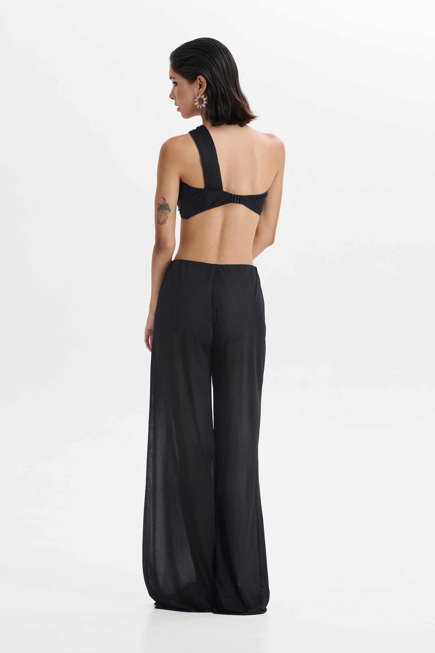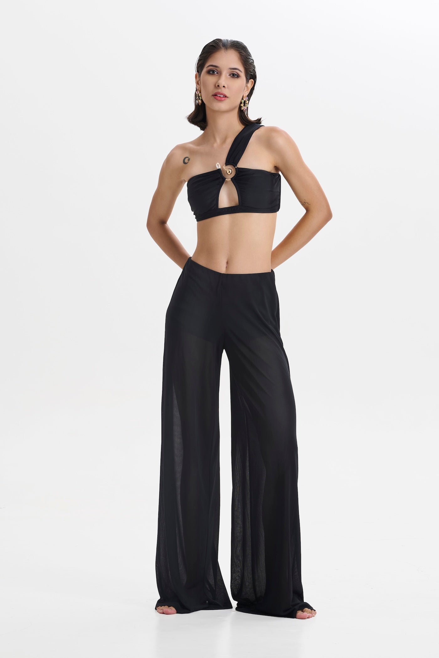 Turn heads from beach to bar in our Black Bandeau Bikini with Sheer Pants Set. The minimalist bandeau top and matching bottoms offer a clean, sculpted fit, while the sheer, flowy pants add instant drama and movement with every step.