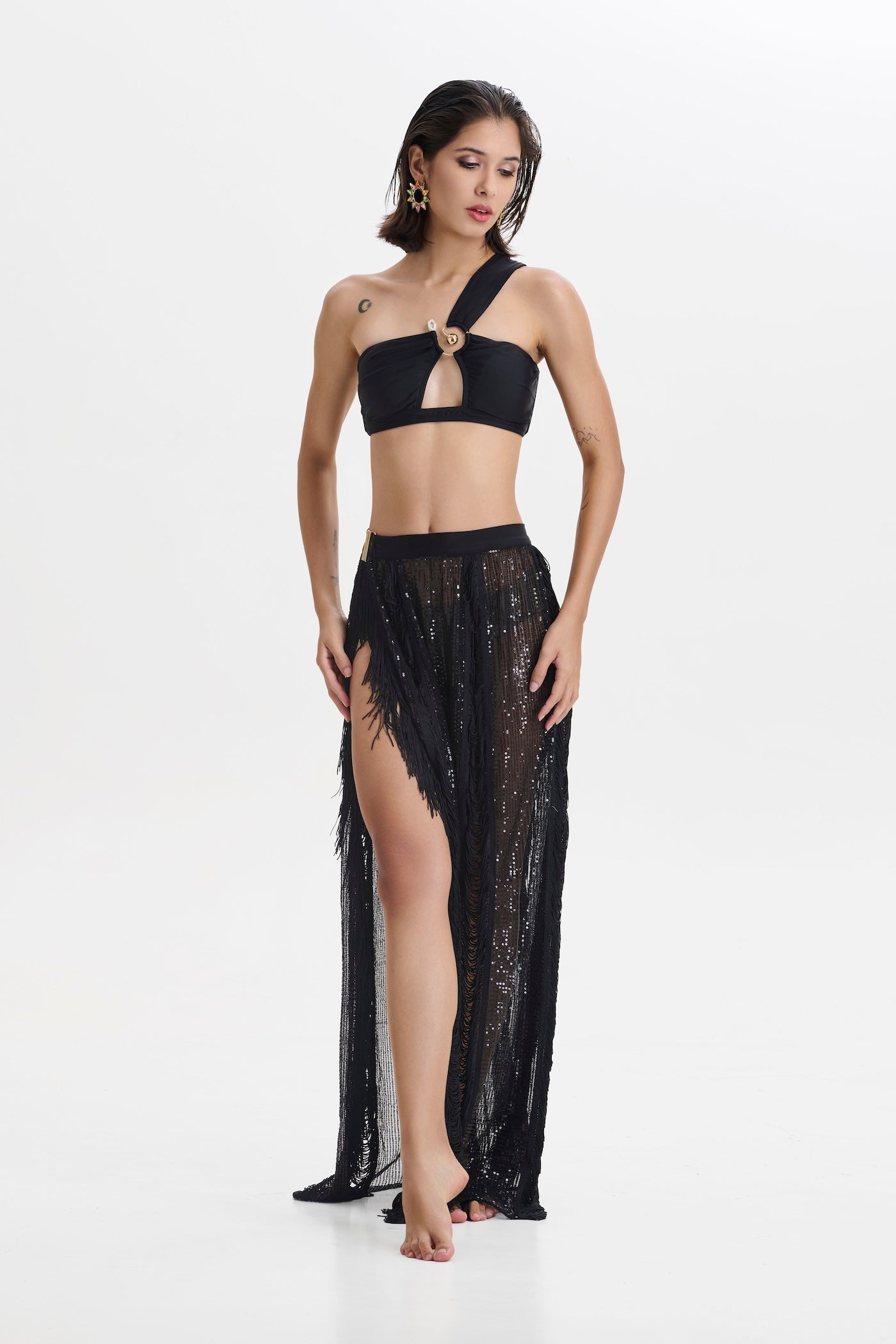 The Olive Sequin and Tassel Skirt is a showstopper crafted for sun-drenched celebrations and moonlit dancing. Adorned with shimmering sequins and playful tassels, it catches every flicker of light and sways with every step. The rich olive hue brings a grounded elegance, while the intricate detailing adds bold, bohemian flair.