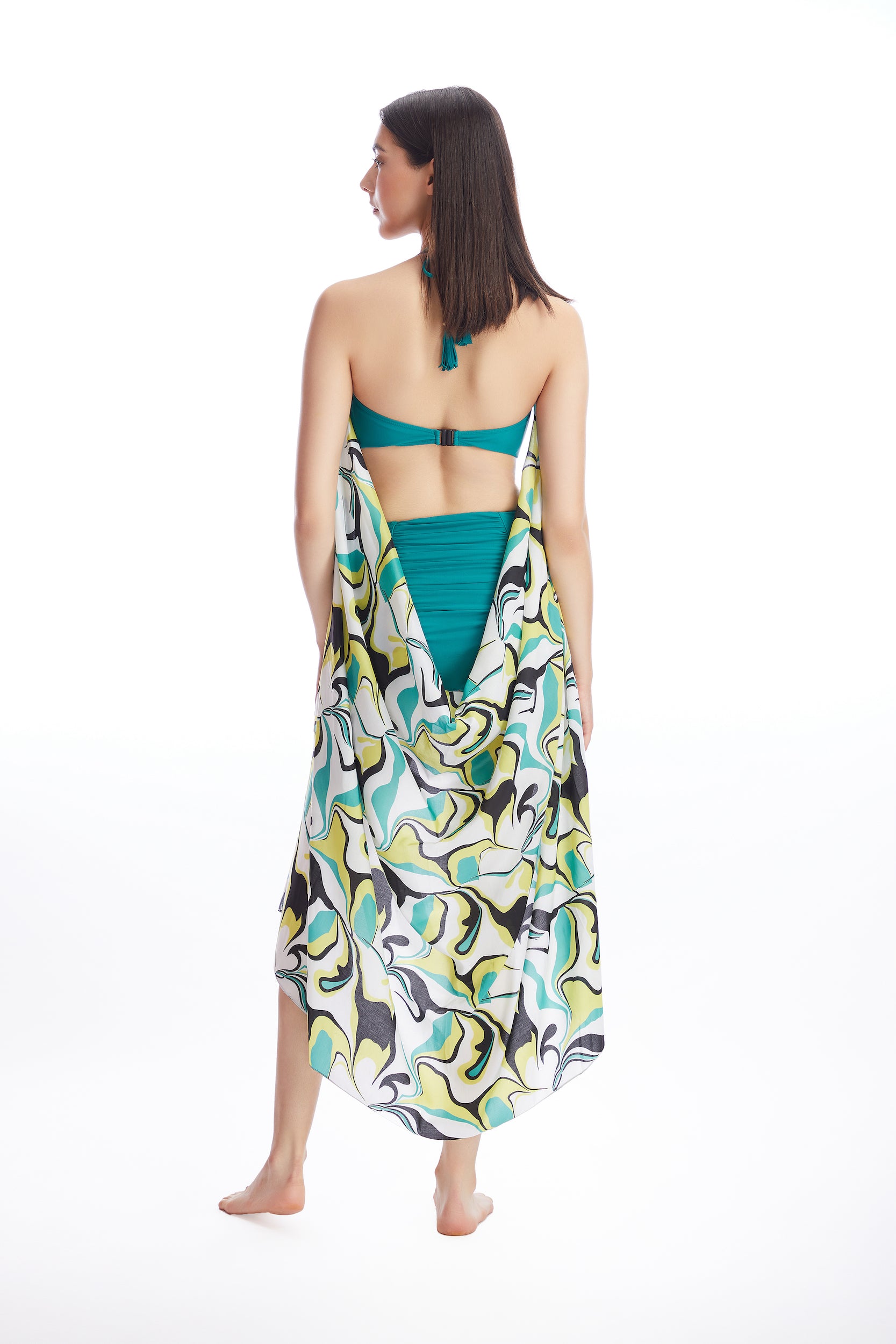 This halter cape showcases a lively green abstract print, bringing an element of artistry and energy to your beach ensemble.