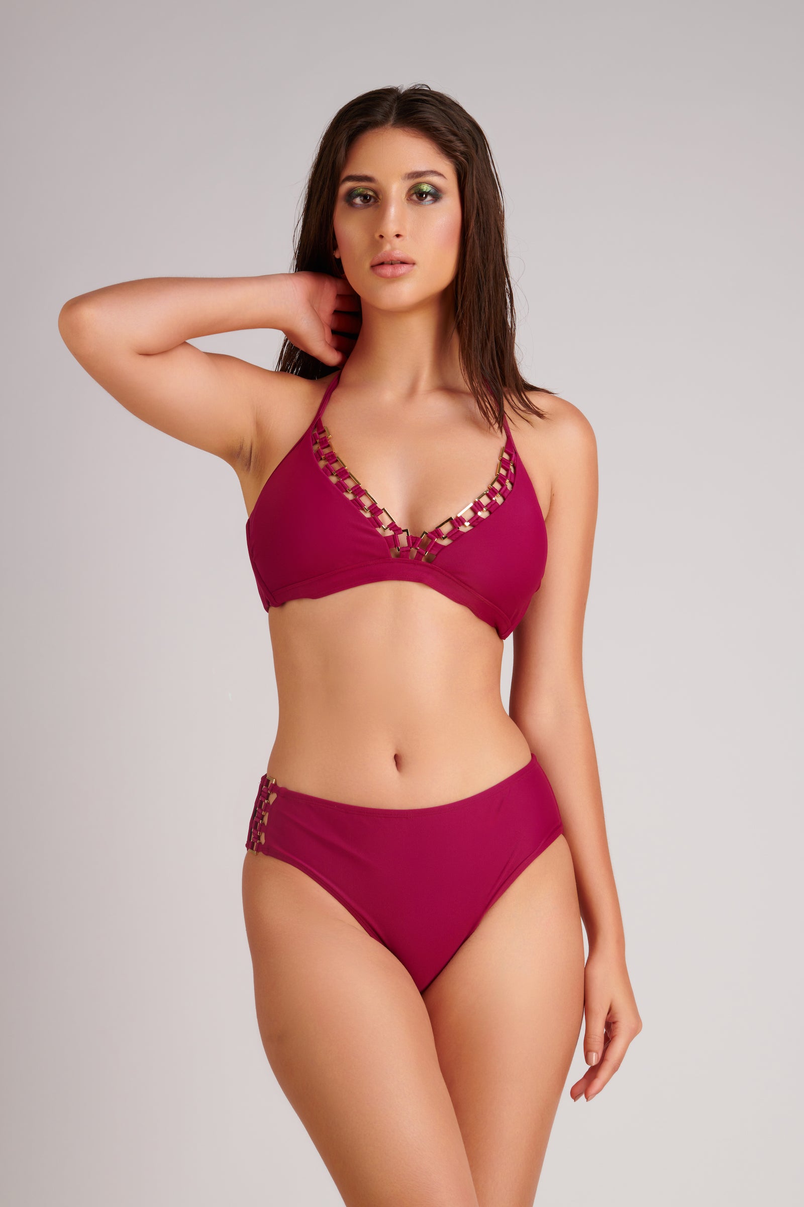 Discover elegance with our Burgundy Bliss Bikini, featuring exquisite handcrafted metal detailing. Embrace sophistication and style with this luxurious piece, perfect for any beach occasion. Elevate your beachwear ensemble with the rich hues of burgundy, ensuring you stand out with effortless beauty and charm. Dive into timeless allure and unparalleled craftsmanship with our exquisite bikini collection
