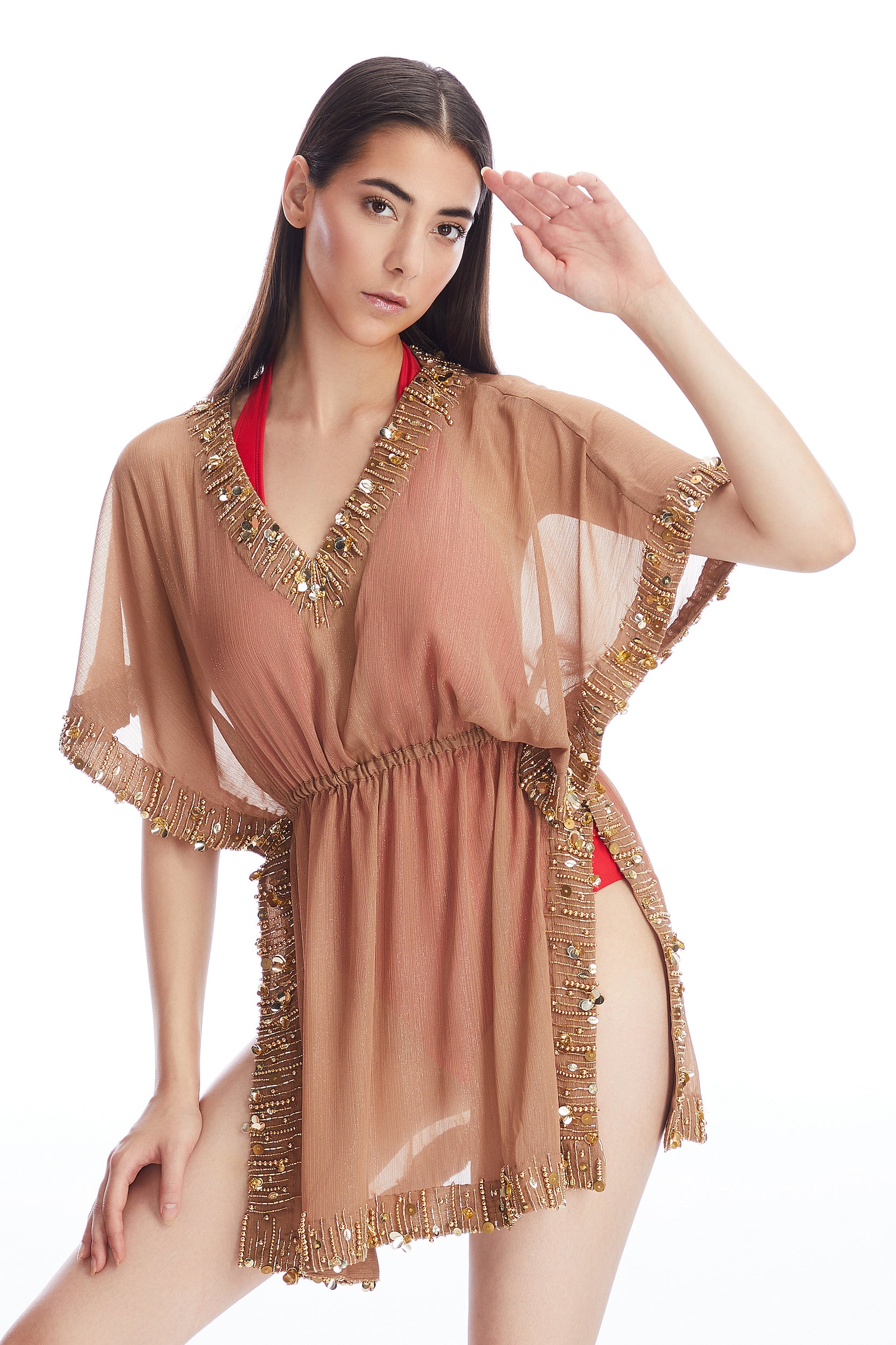 1. Opulent Gold Embroidery: Our beach kaftan is adorned with intricate gold embroidery that adds a touch of luxury and sophistication, making it the perfect choice for special beach or poolside occasions.