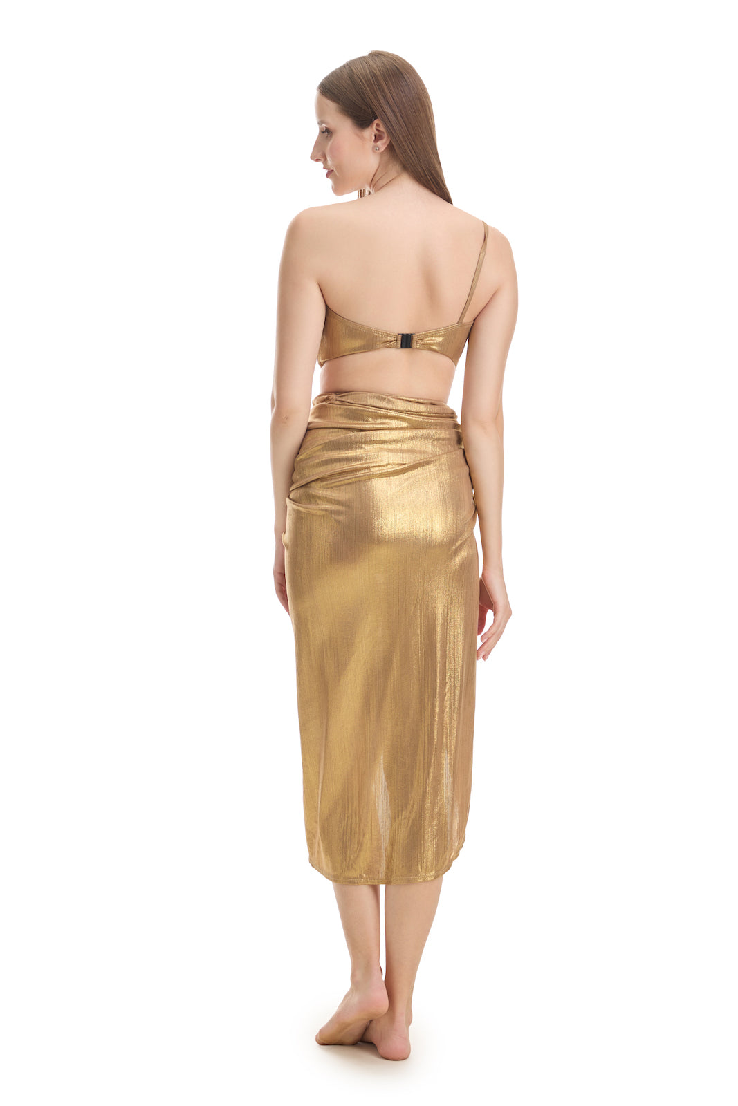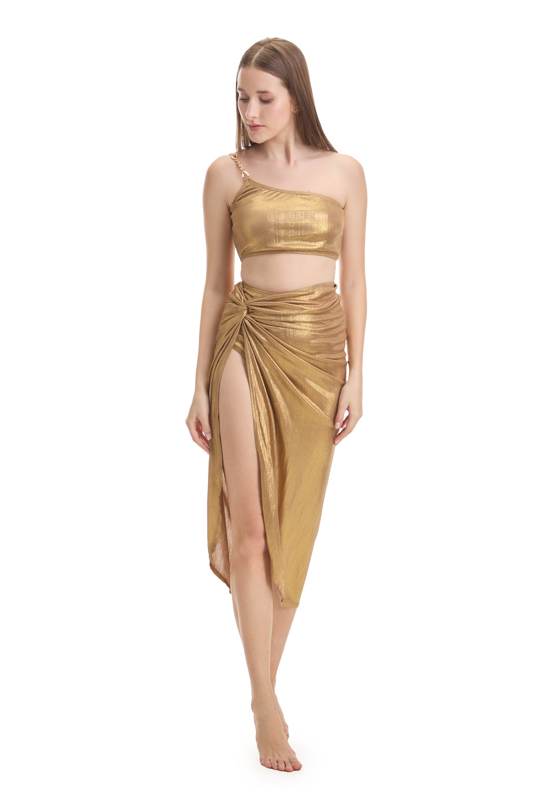 Turn heads this season in our Gold One Shoulder Bikini Set with Skirt—an elegant and versatile choice that brings glamour to any occasion!