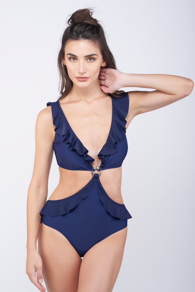 This cutout monokini with frills lays style goals on beach and at pool parties. Metal detailing makes it a favourire for luxury holidays . .Looking for the same design in a different color or print ? Email us to customize it!Team it with any of our cover-ups/ skirt or shorts for a stylish beach look!