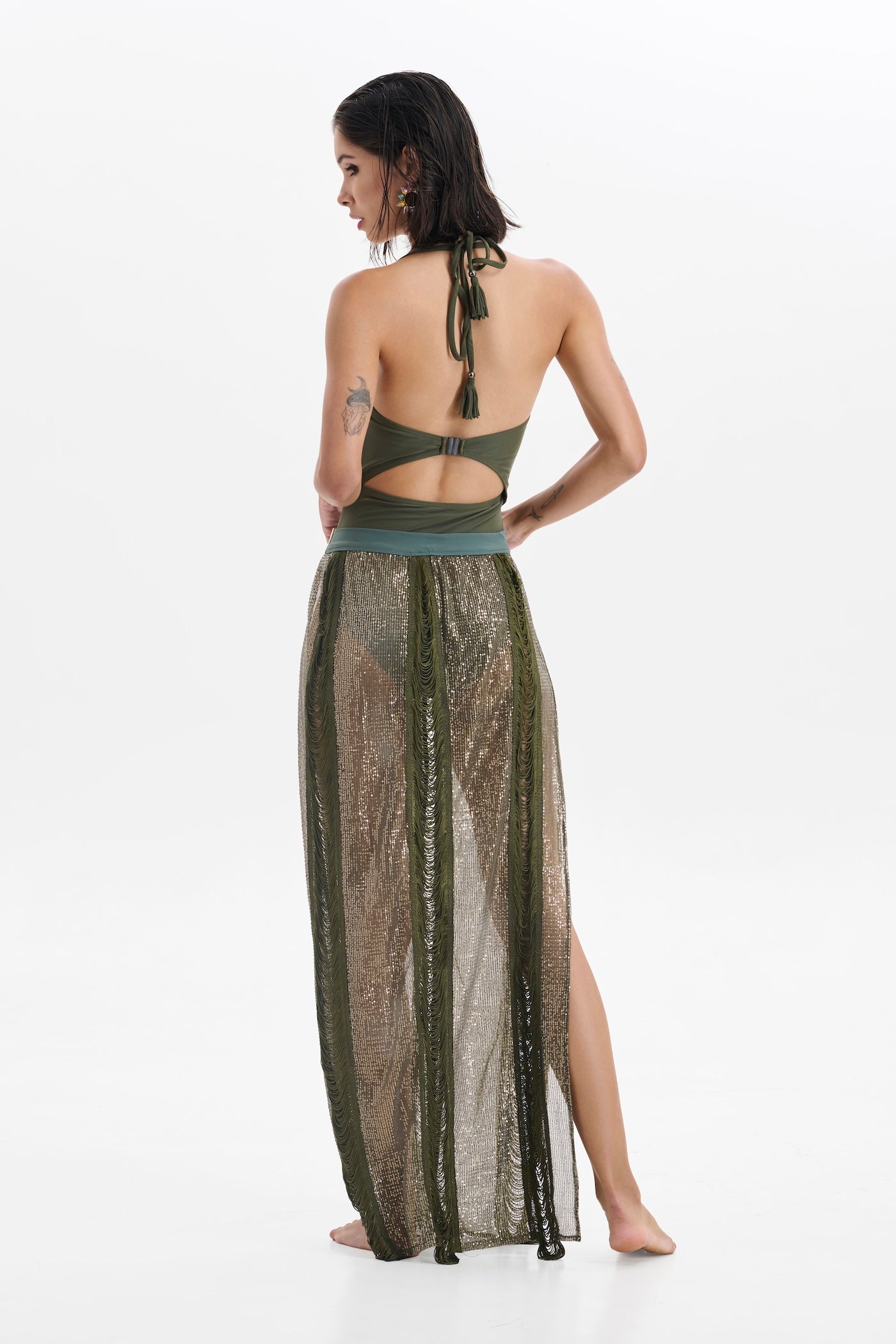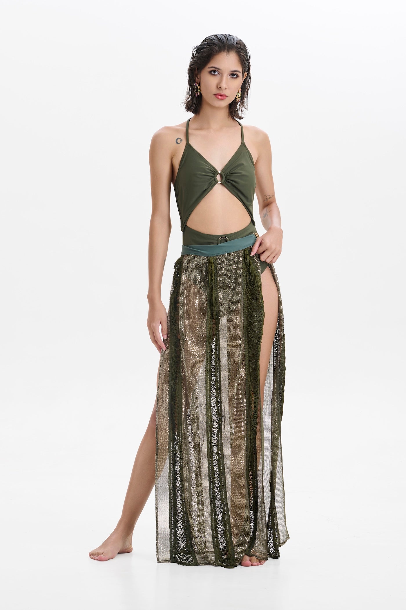 The Olive Sequin and Tassel Skirt is a showstopper crafted for sun-drenched celebrations and moonlit dancing. Adorned with shimmering sequins and playful tassels, it catches every flicker of light and sways with every step. The rich olive hue brings a grounded elegance, while the intricate detailing adds bold, bohemian flair.