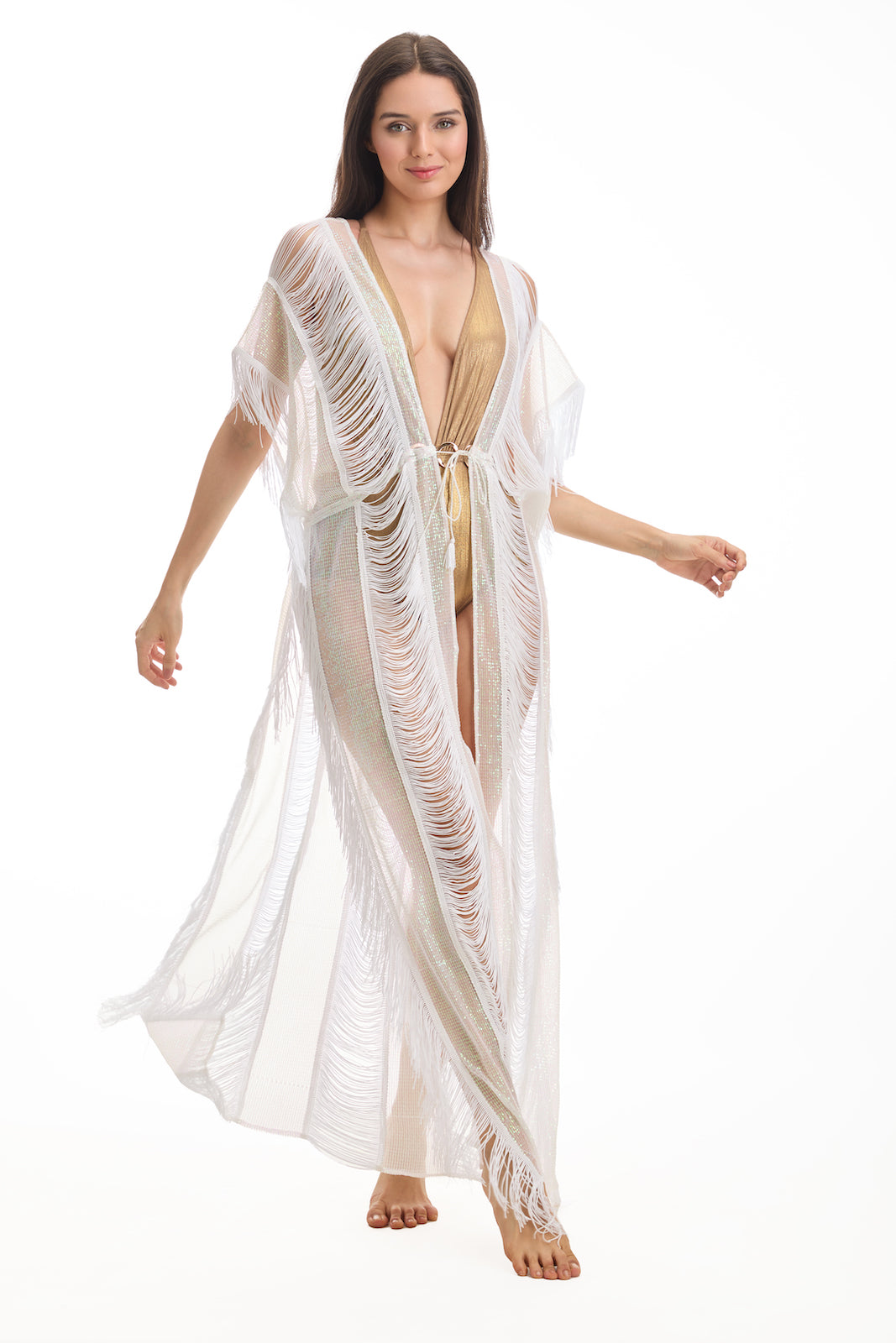 Add a touch of glamour to your beachwear with our Sequin and Tassel Long Coverup in White. This stunning coverup is designed to elevate your poolside or beach look with its sparkling sequin embellishments and playful tassel details, making it the perfect statement piece for sunny days.