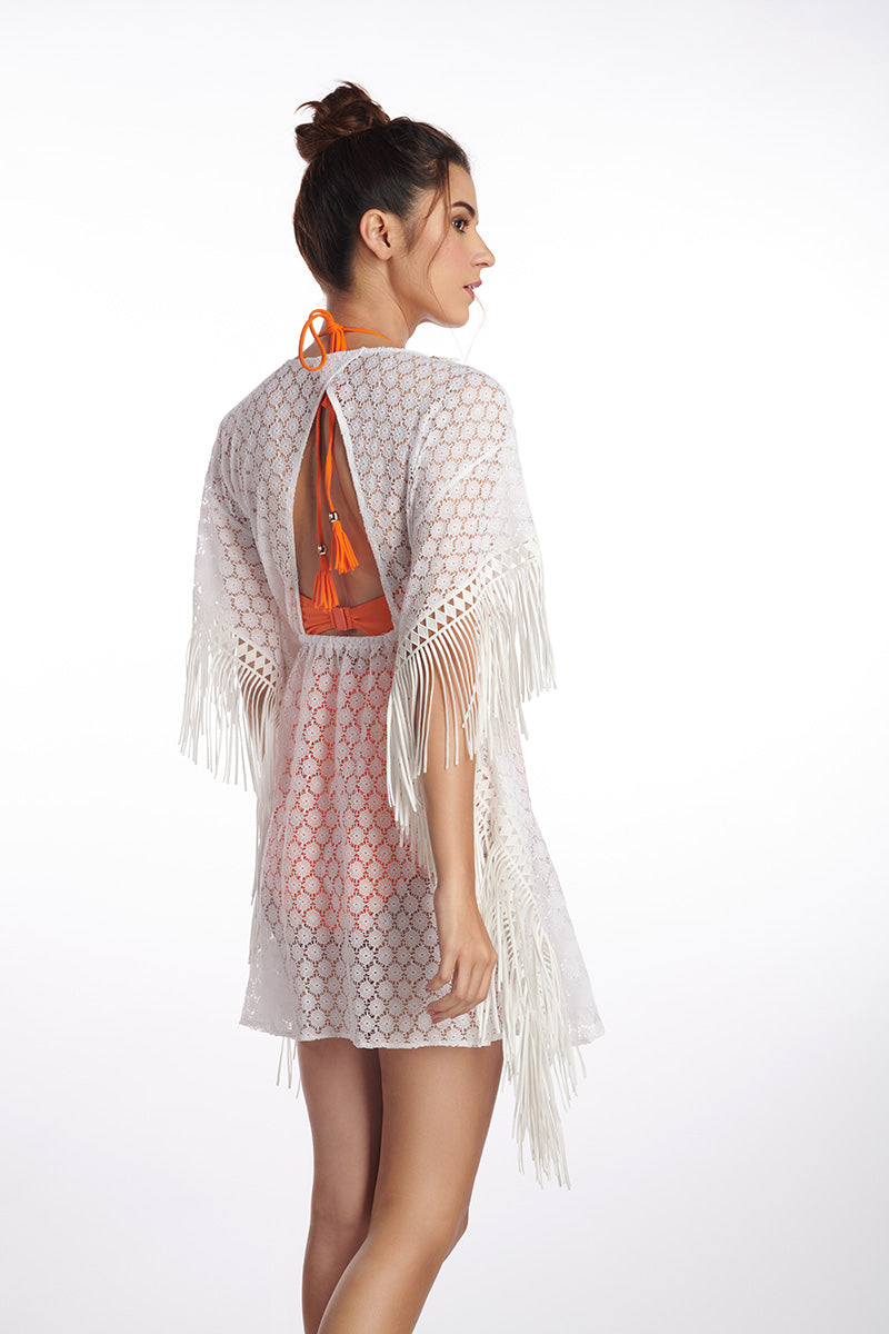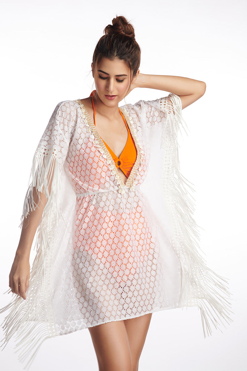 The kaftaan is versatile and easy to style, making it a perfect addition to your beachwear collection. It can be worn as a cover-up over your swimsuit or dressed up with sandals and jewelry for a chic beach look. The fringe detailing adds a playful touch to your outfit, making it perfect for a casual day out or a beach party.