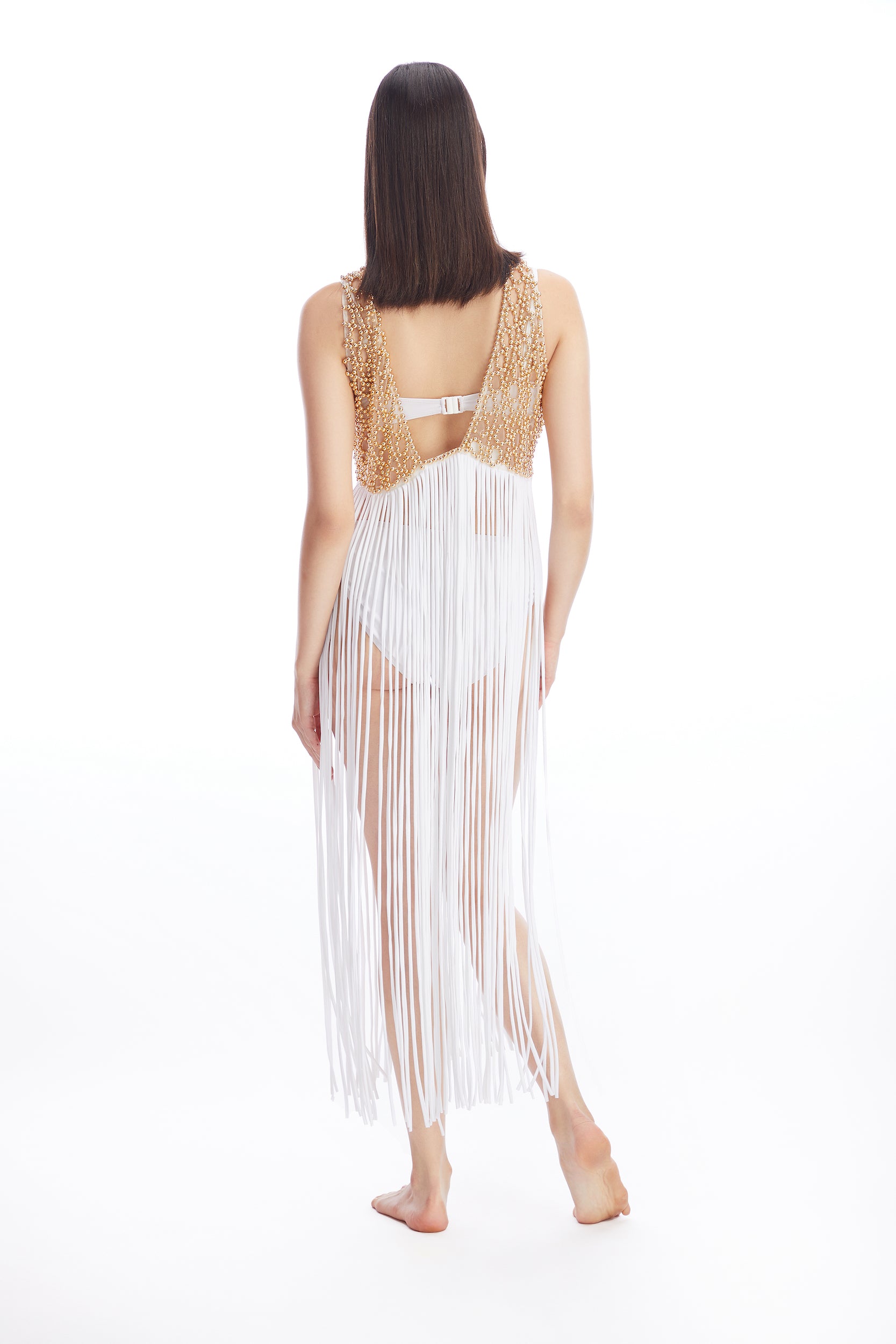Turn heads and radiate beachside glamour with our exquisite Zanzibar Cape, adorned with lavish gold beads that shimmer in the sun. This dazzling detail adds a touch of luxury to your beach ensemble, making you the center of attention wherever you go.